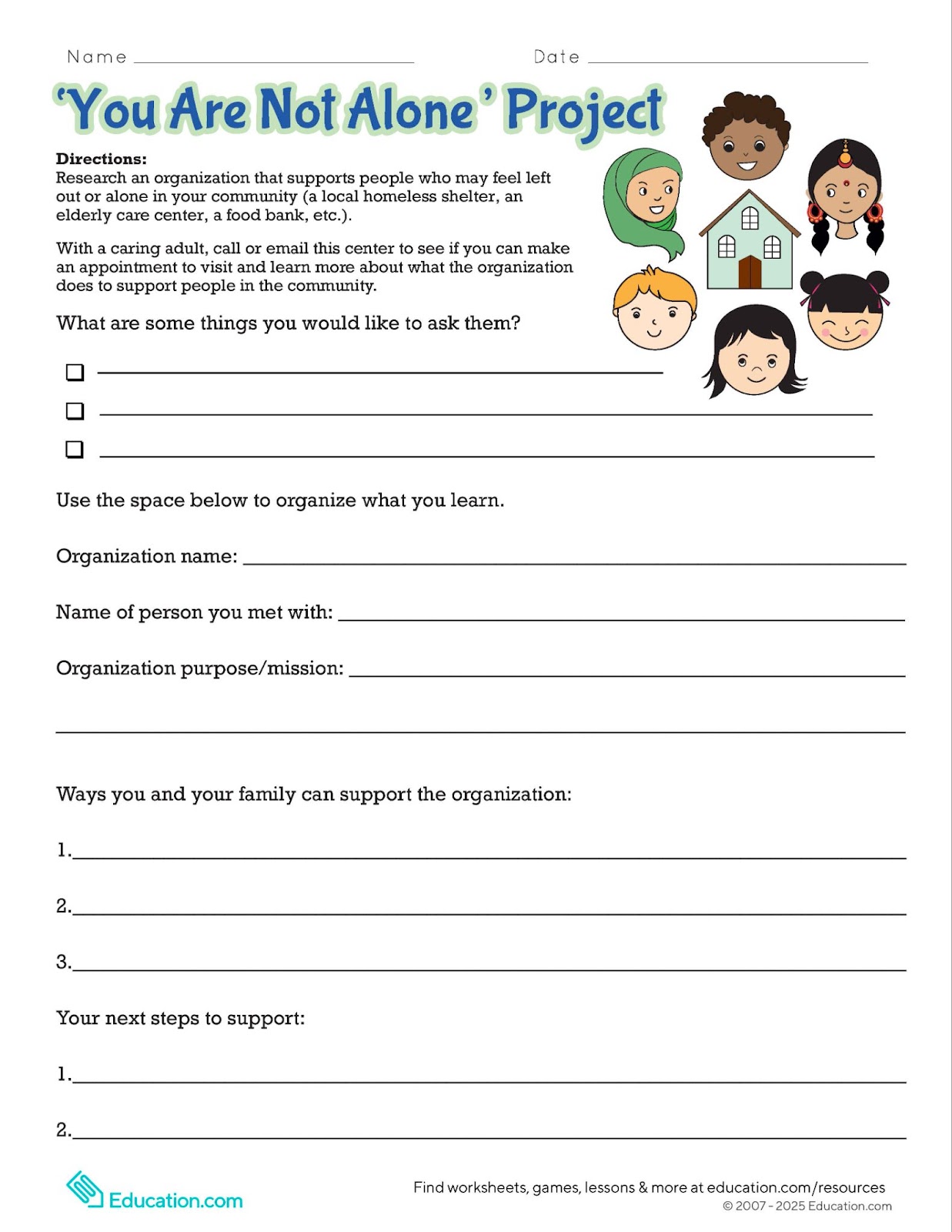 Encourage learners to connect with their community and spread kindness. This activity asks kids to learn about local organizations that support those who may feel left out and brainstorm ways to help through letters, outreach, or volunteering.