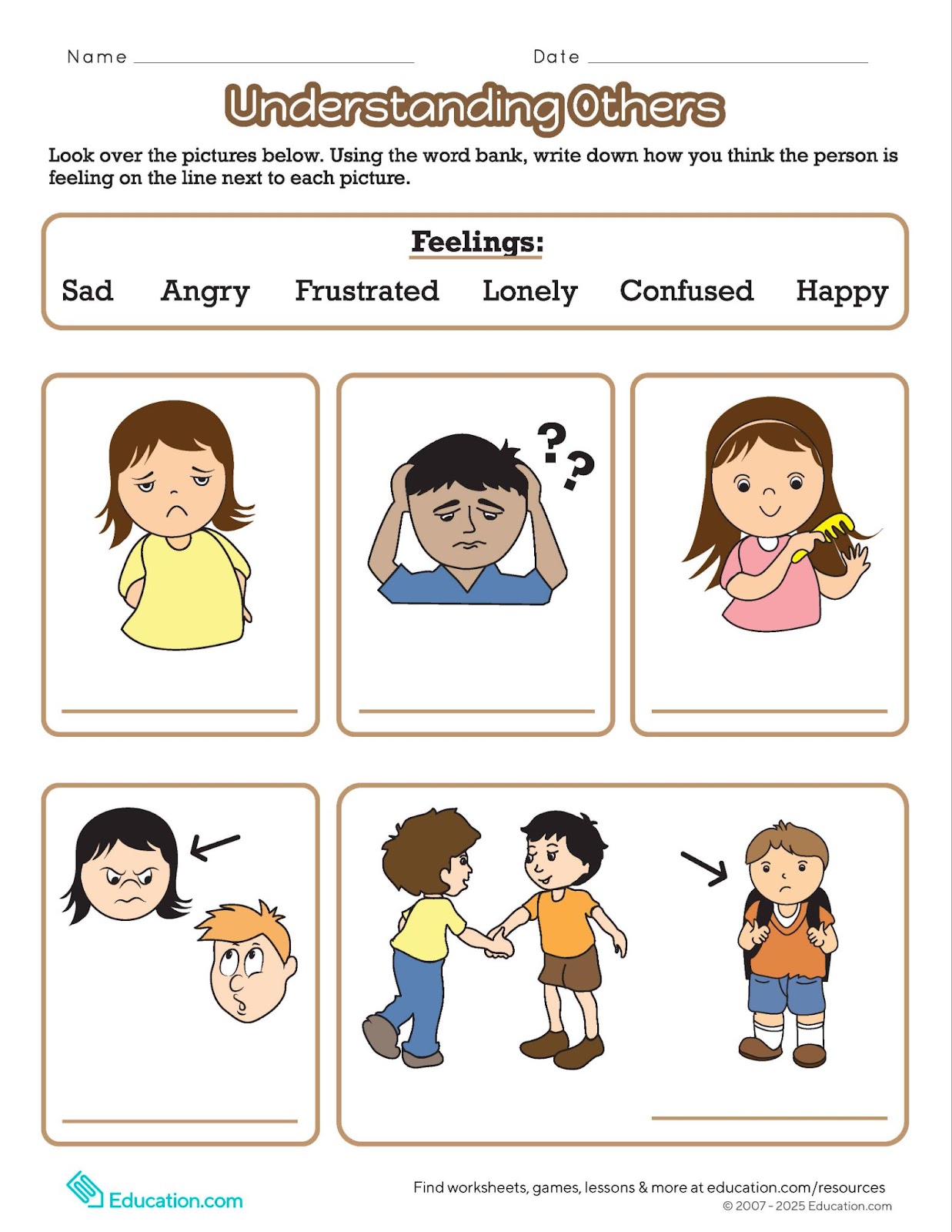 Looking at facial expressions is an approachable way for kids to begin learning about moods. This worksheet guides them to examine their inner thoughts and consider how others might feel in different situations.