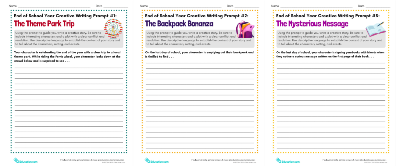 Inspire students with writing prompts that spark creativity and storytelling. Whether spotting something strange from a Ferris wheel, finding a surprise in a backpack, or discovering a secret message in a yearbook, students will craft vivid stories with interesting characters and clear plots. Perfect for fourth through eighth graders, these worksheets offer an opportunity to practice creative writing as the school year wraps up.