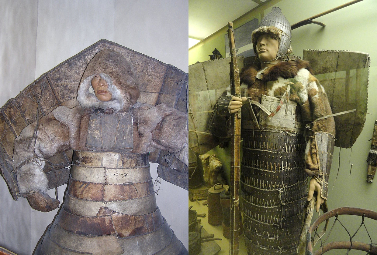 (L) Laminar armor worn by native Siberians (L), warrior armor and sinew bow, 19th century (R).