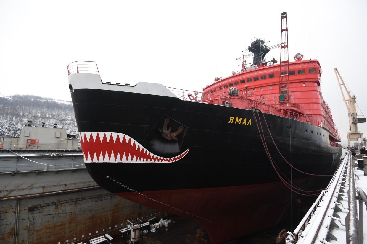 Equipped with two nuclear reactors, the Yamal has helped transport researchers to floating ice and in 2000 made a voyage to the North Pole. The vessel is also recognizable by the distinctive shark jaw painted on its hull.
