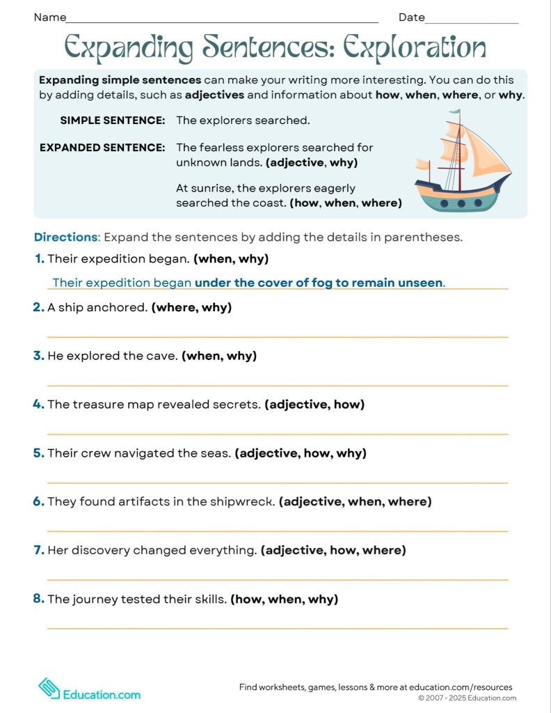Encourage fifth through eighth graders to turn simple sentences into detailed descriptions. As students add details about where, when, why, and how, they’ll practice using adjectives and noun phrases while writing about exciting topics like treasures and shipwrecks.
