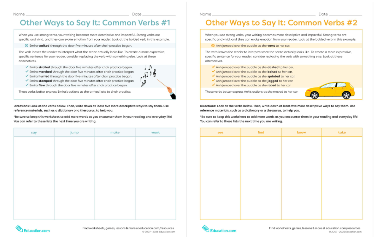 Help middle school writers expand their vocabulary and strengthen their grammar skills with this set of seven worksheets! Each activity challenges students to replace common verbs, adjectives, and adverbs with more vivid and descriptive alternatives, so they can become more confident and expressive communicators.