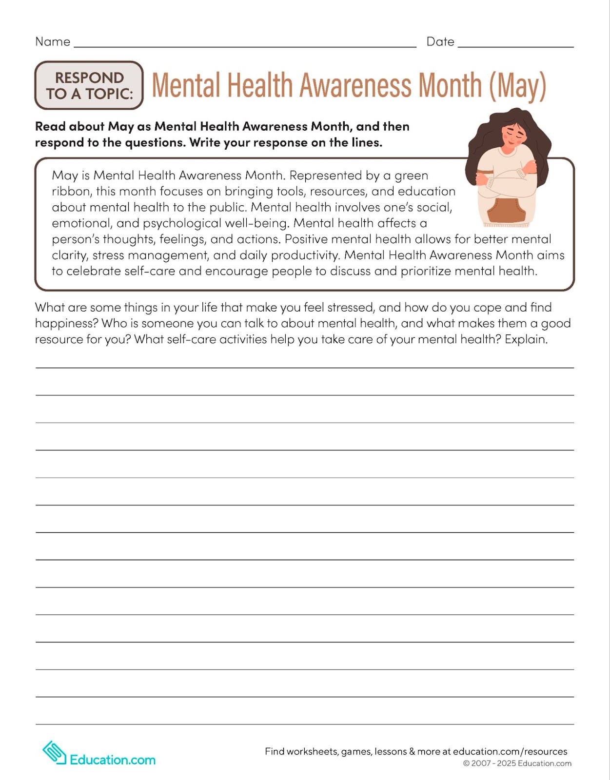 In this writing prompt, learners will learn about the importance of mental health and respond to reflective questions that foster empathy, self-awareness, and meaningful conversation. It’s a great way to strengthen writing skills while supporting emotional growth during this month.
