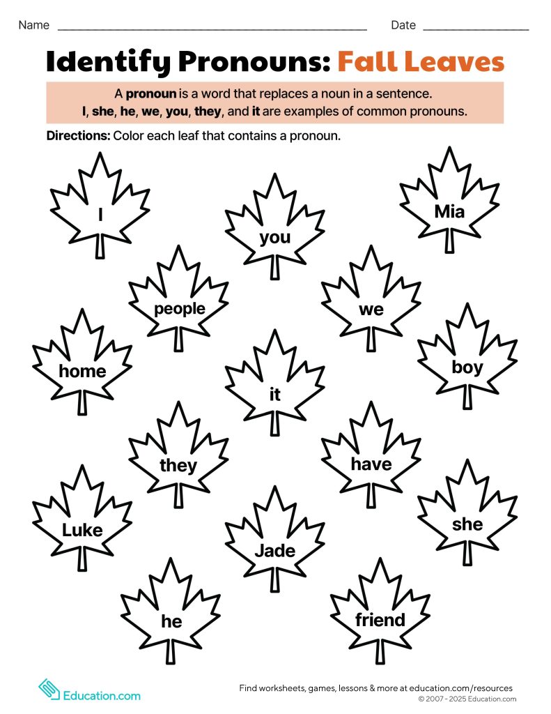 Kindergarteners and first graders will search for pronouns like I, you, and they, coloring each leaf they find to create a vibrant autumn display. This resource strengthens essential language skills, helping young learners gain confidence in reading and writing.