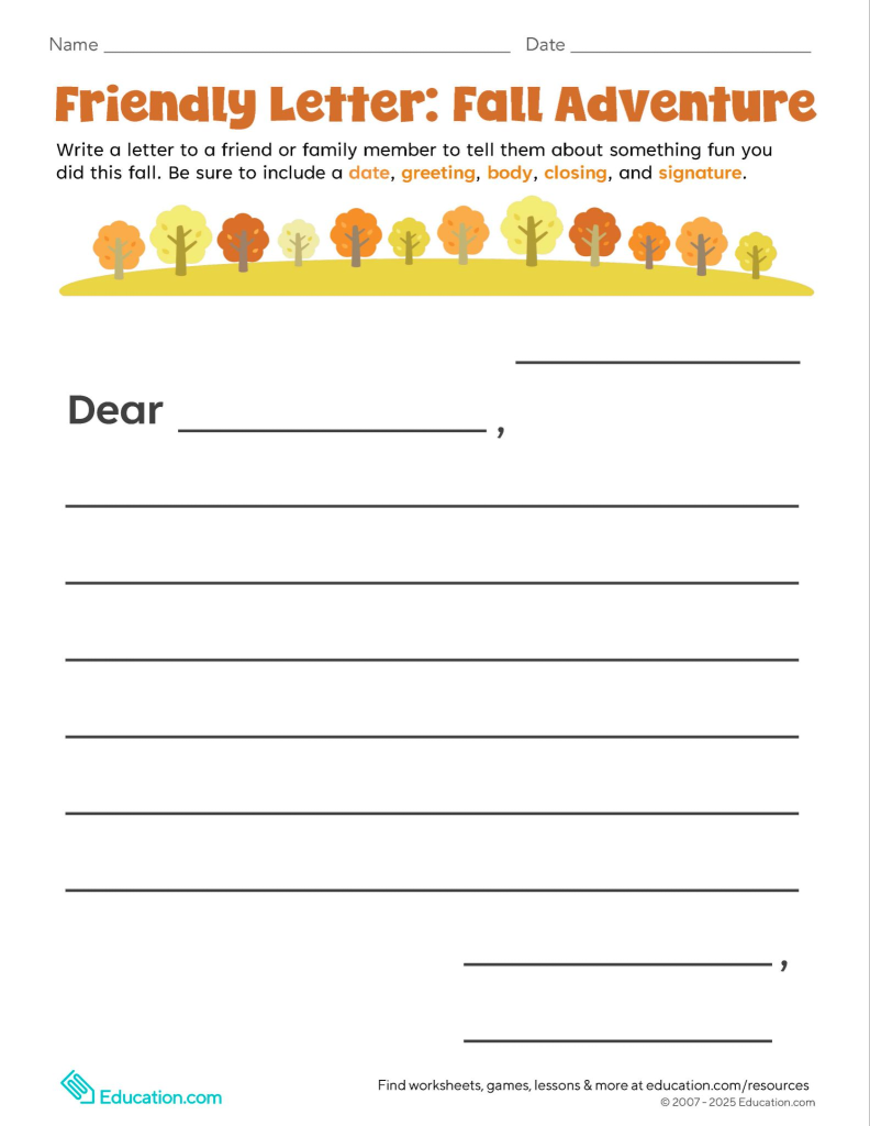 Have your young learners share their fall adventures with this letter worksheet! First and second graders will practice all the parts of a letter, from the greeting and body to the closing and signature, while reflecting on a seasonal experience.