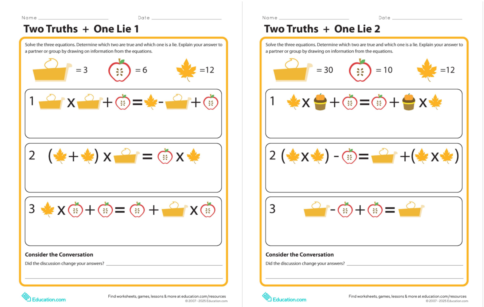 Introduce this classic icebreaker to math class! Perfect for fifth grade, these worksheets challenge students to solve equations, identify the false statement, and explain their thinking. Along the way, learners strengthen their understanding of order of operations, parentheses, and problem-solving skills.