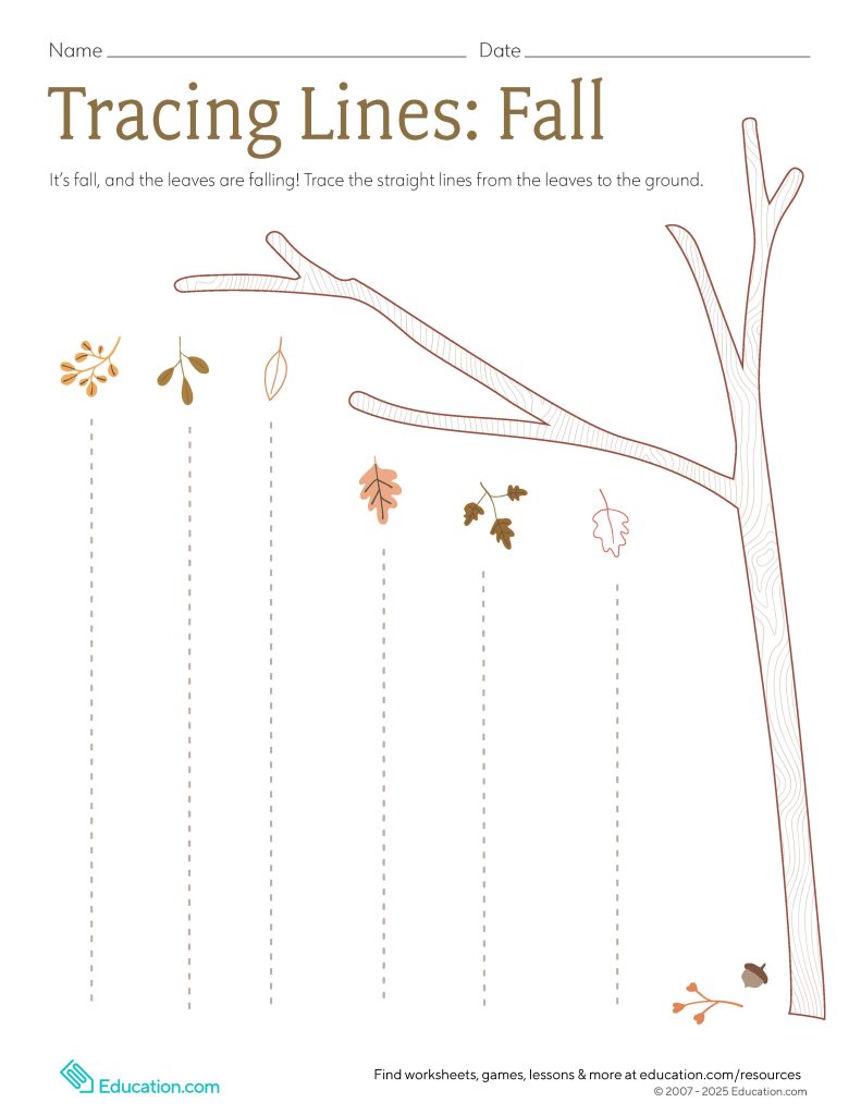 Watch the leaves fall with this preschool tracing worksheet! Little learners trace straight lines from leaf to ground. Great for both home and classroom use, this worksheet helps prepare kids for handwriting by building the skills needed for writing numbers and letters.