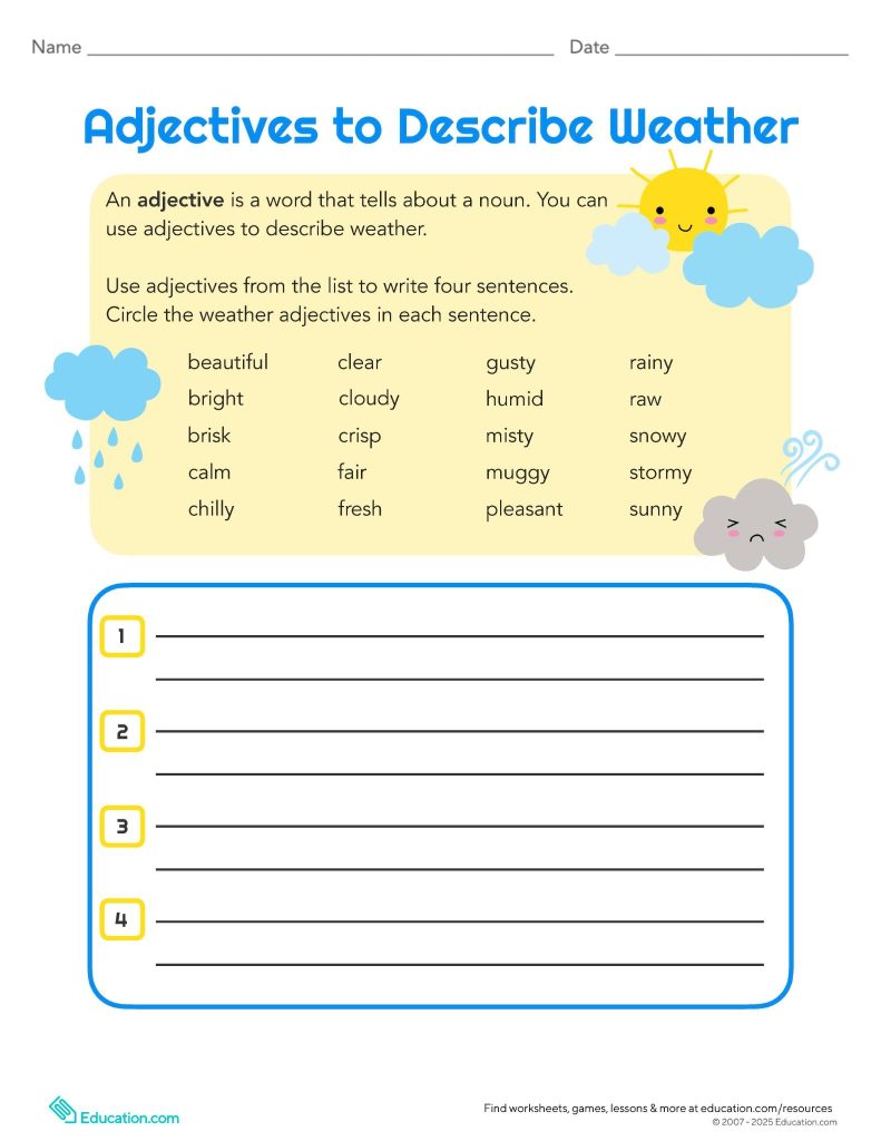 Learners use weather-related adjectives to write sentences about the weather, circling the adjectives they include. Designed for grades 2–4, this activity helps learners apply grammar skills in context and make their writing clearer and engaging.