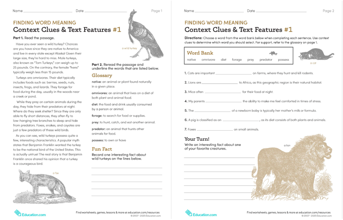 Fourth and fifth graders practice identifying the meaning of unfamiliar words while reading a passage about the wild turkey. By rereading for understanding and using a glossary and word bank, students build strong vocabulary and nonfiction reading skills.