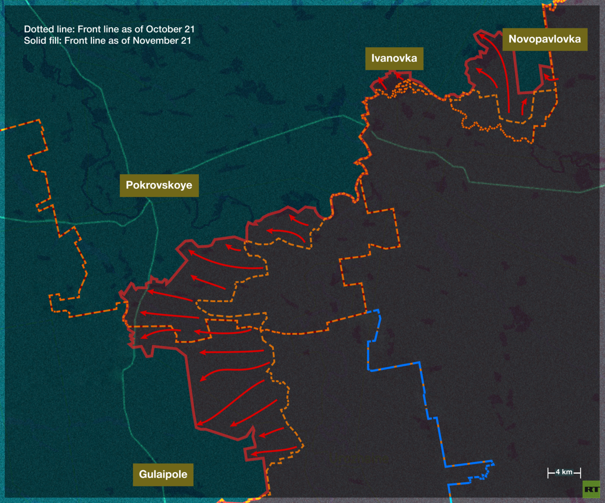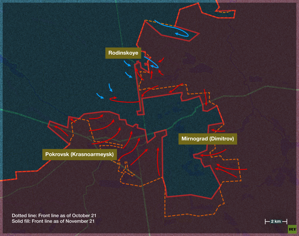 By October, between 2,000 and 5,000 Ukrainian troops had been encircled in Pokrovsk and Mirnograd (Dimitrov). During the first half of November, the AFU attempted to break the siege through Rodninskoye, but each attempt collapsed. By November 15, Pokrovsk had been fully taken, and Rodninskoye partially taken – effectively closing the ring around Mirnograd.