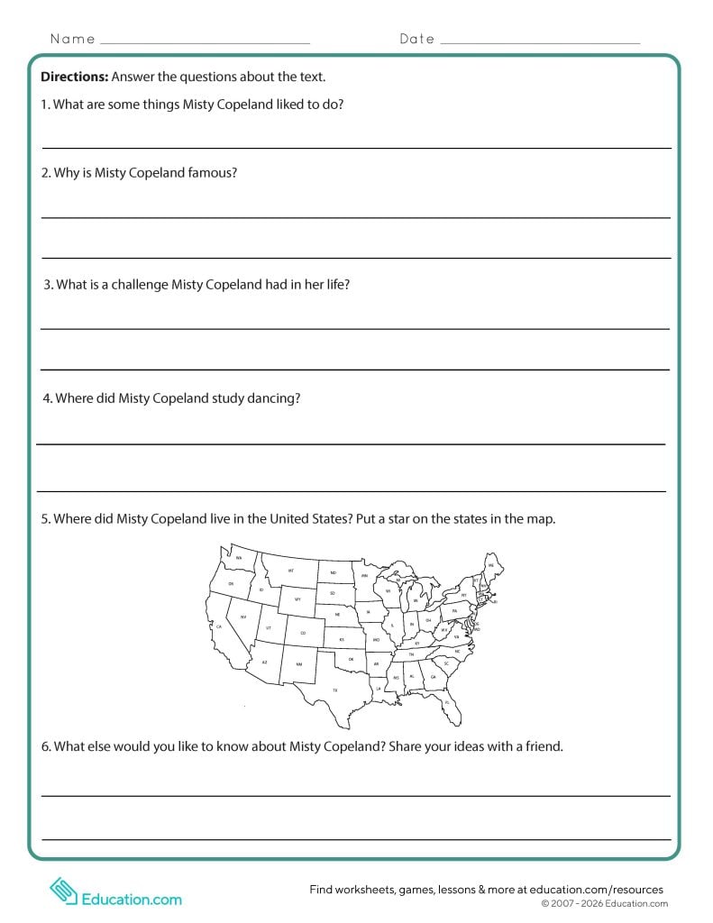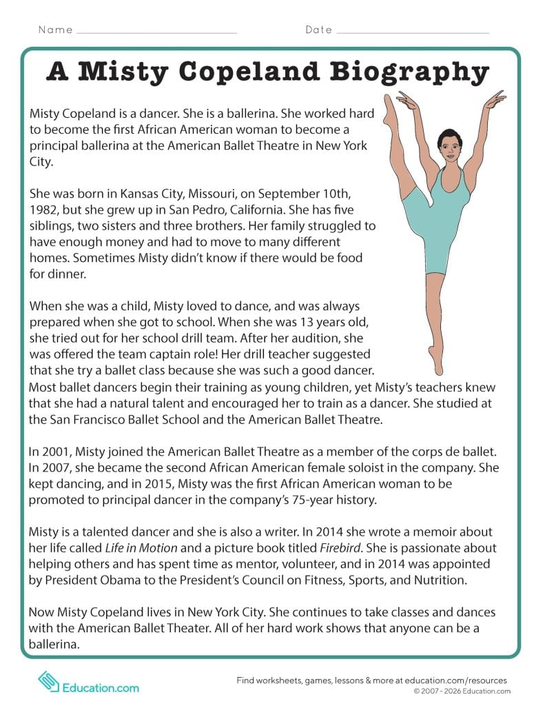 Fourth and fifth graders discover the story of Misty Copeland, the first African American woman to become a principal dancer with the American Ballet Theatre. Comprehension questions and a mapping activity guide students in capturing key details while developing nonfiction reading skills.