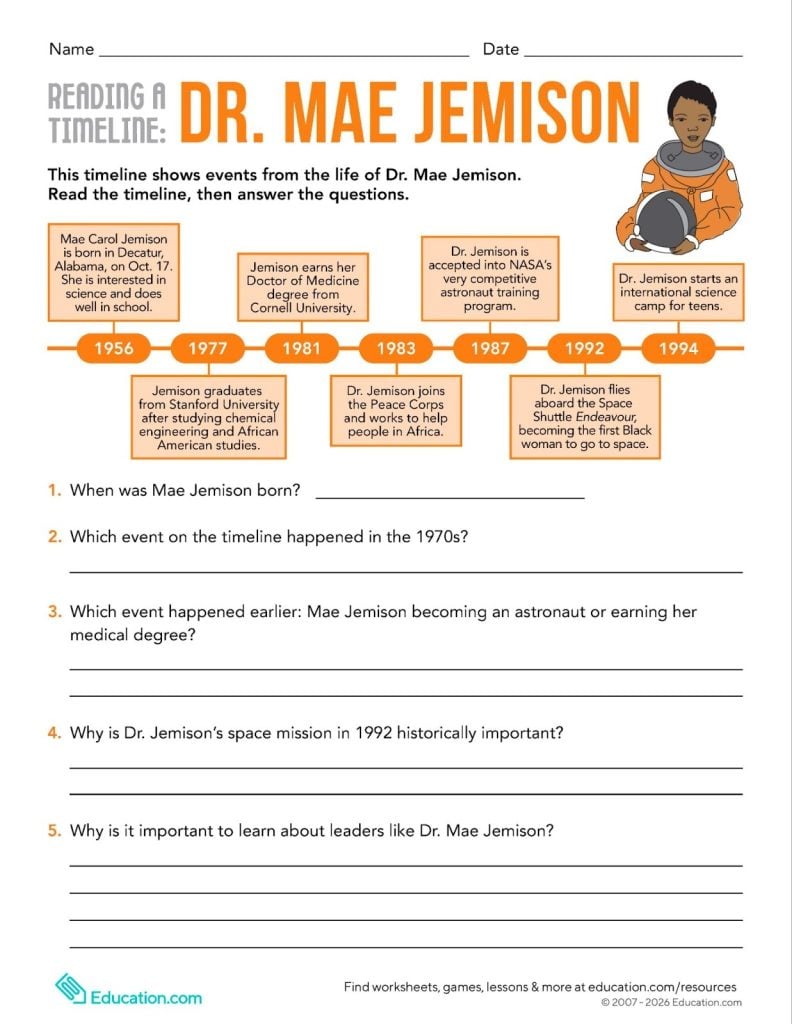 Middle-grade learners follow a timeline of Dr. Mae Jemison, the first Black woman in space, and answer questions about the order and significance of her achievements. This activity develops timeline-reading and analytical skills while highlighting her contributions to science and history.