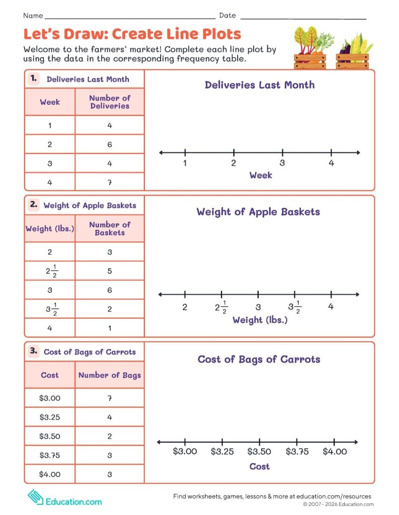 Sixth graders put their data skills to work with this hands-on line plot worksheet. Using farmers’ market data on deliveries, apple baskets, and carrot bags, students create three different line plots to organize and display information clearly.