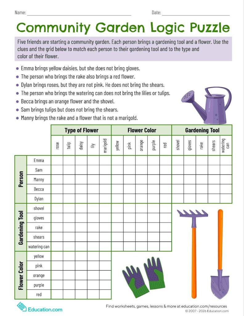 Sixth through eighth graders put their logic to work in this engaging community garden puzzle. Students follow clues to pair each friend with the correct tool, flower type, and color, strengthening problem-solving and analytical thinking.