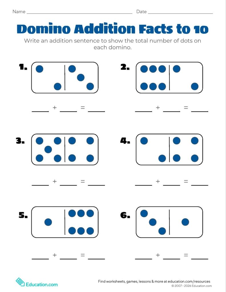 Kindergarten and first grade students practice addition facts within 10 using familiar domino visuals. Learners write addition sentences based on the dots they see, then solve to find each sum. This worksheet supports fact fluency and lays the groundwork for adding and subtracting within 20.
