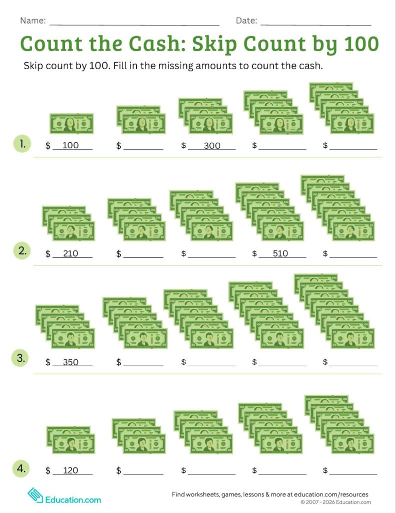 Help second graders build confidence with three-digit numbers in this money-themed activity. Learners count by 100 to complete each sequence, using images for added support as they strengthen place value understanding.